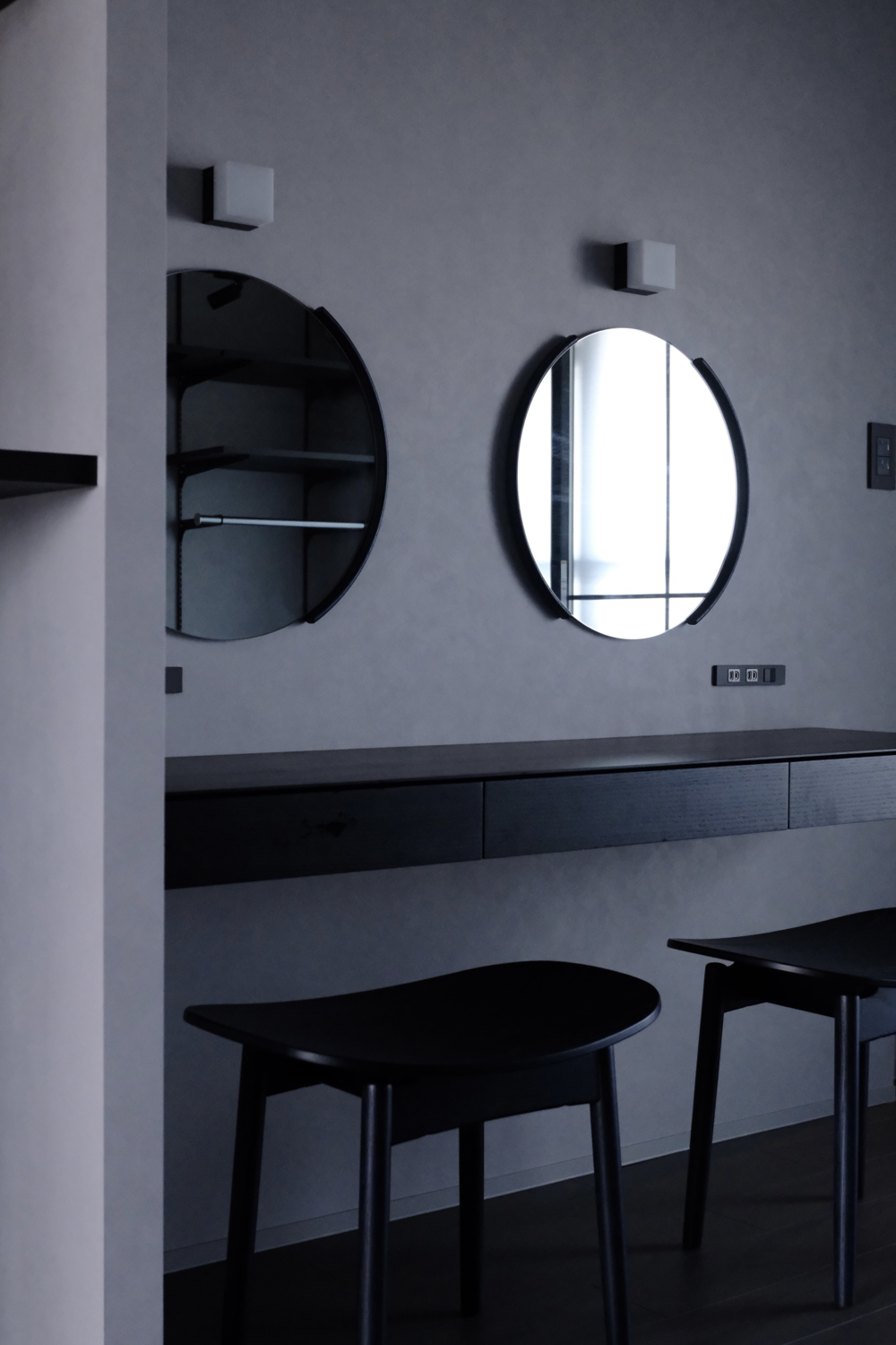 さらにドレッサールームには、サガスツールとスプリットミラーを設え、慌ただしい朝の時間さえも優雅な儀式へと変える、私的な聖域を創り上げました。ARIAKEのプロダクトが持つ確かな素材感が、日常の風景に奥行きを与えます。